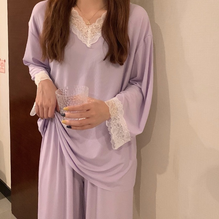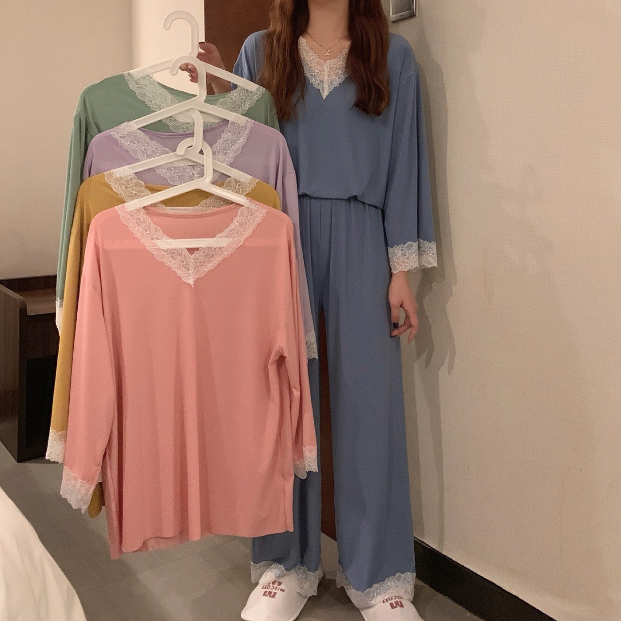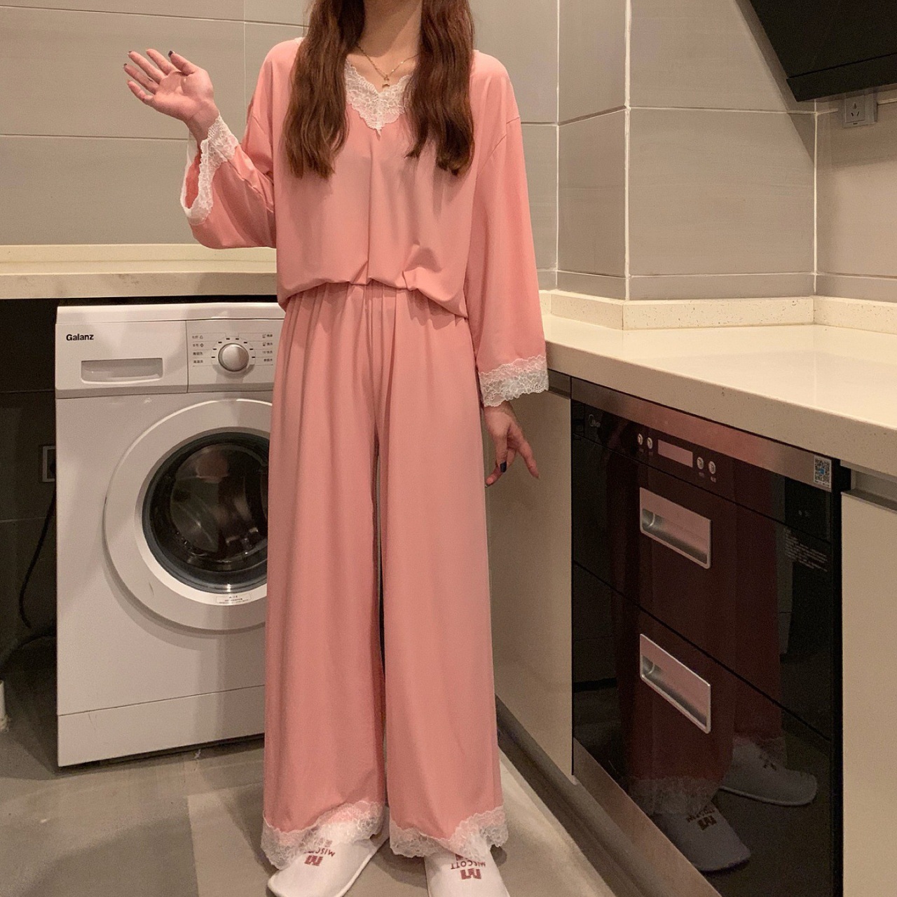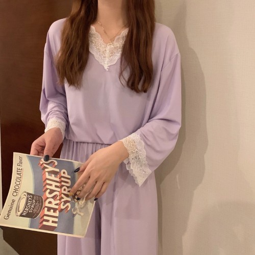 ຄໍເສື້ອຮູບຕົວ V ແຂນຍາວ ແລະ ໂສ້ງຂາຍາວ, ໃຫ້ຄວາມຜ່ອນຄາຍ ແລະ ສະຫງ່າງາມ, ເໝາະສຳລັບໃສ່ຢູ່ເຮືອນໃນລະດູຮ້ອນ.