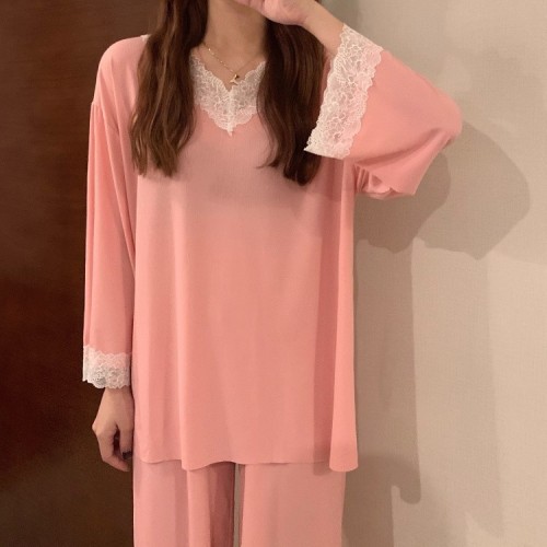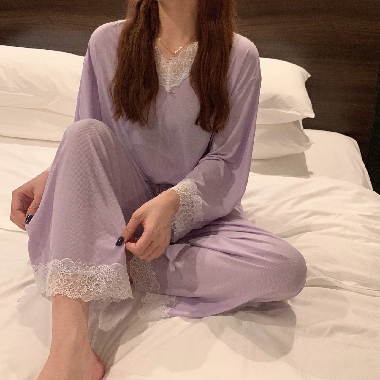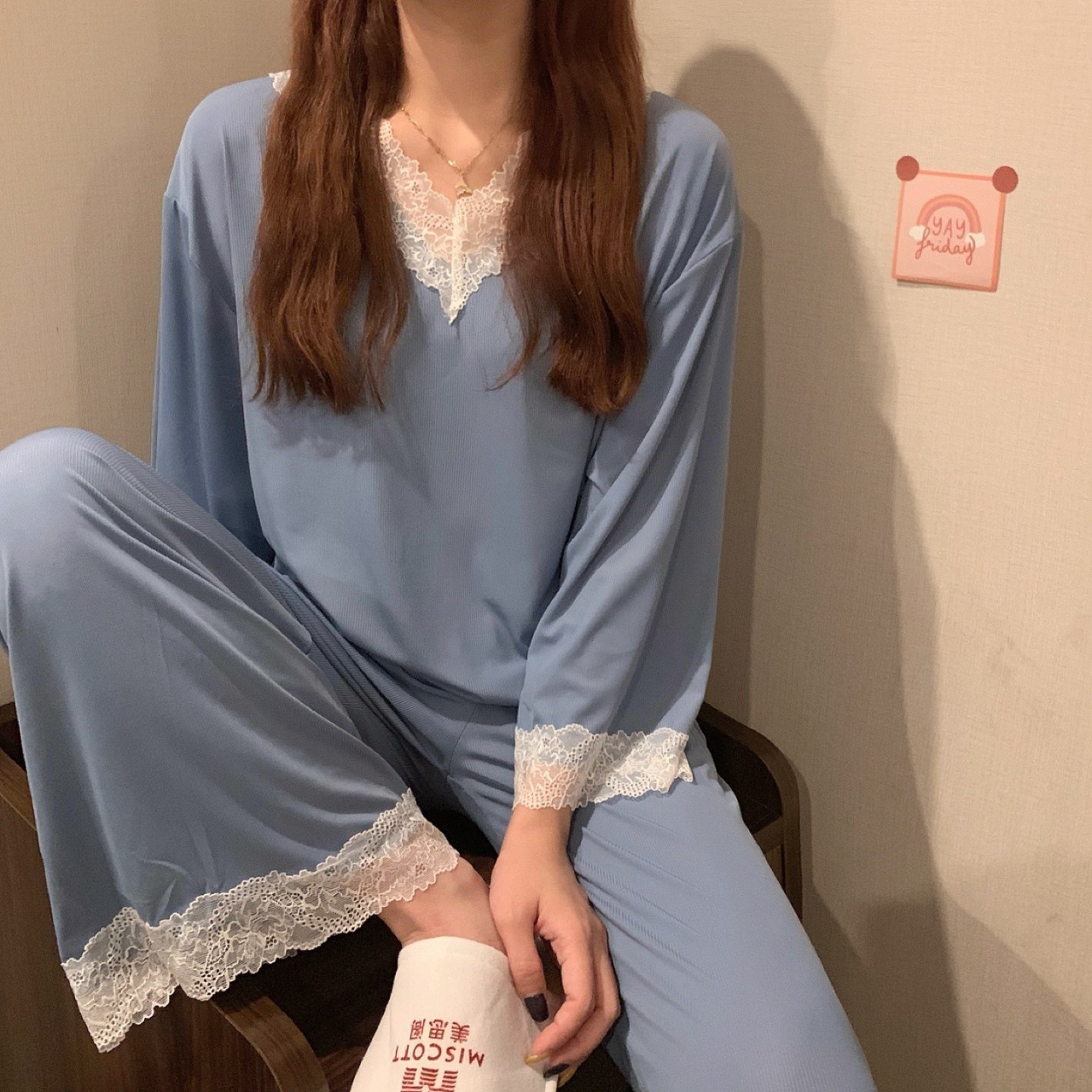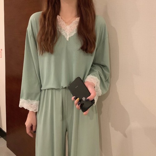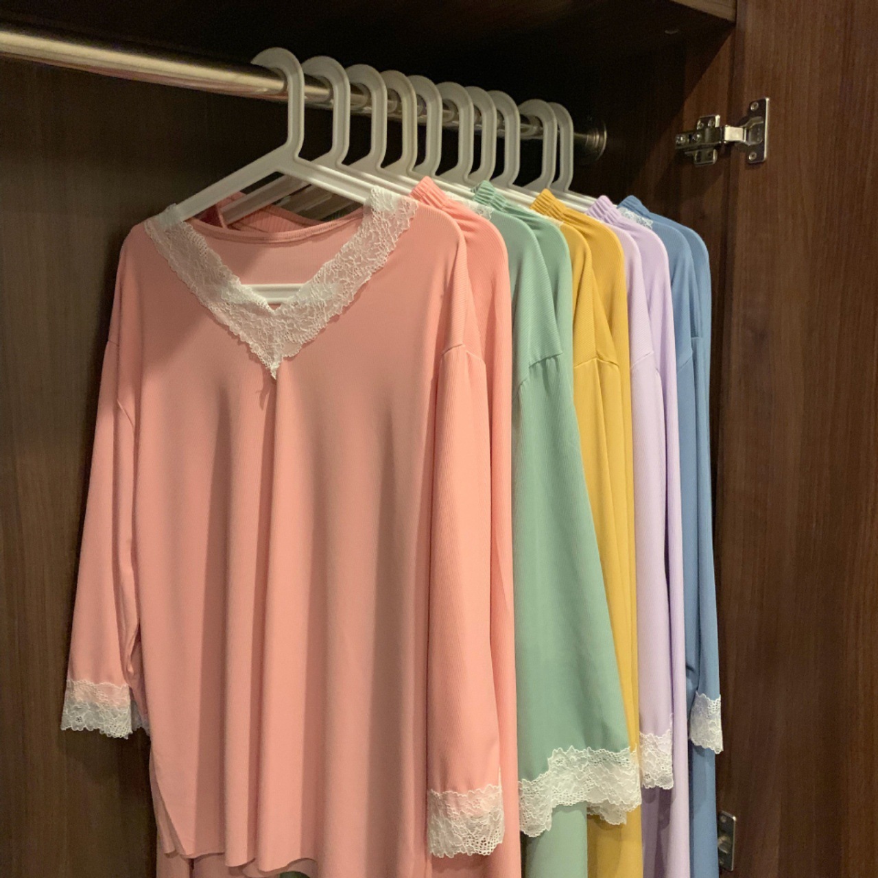 ຄໍເສື້ອຮູບຕົວ V ແຂນຍາວ ແລະ ໂສ້ງຂາຍາວ, ໃຫ້ຄວາມຜ່ອນຄາຍ ແລະ ສະຫງ່າງາມ, ເໝາະສຳລັບໃສ່ຢູ່ເຮືອນໃນລະດູຮ້ອນ.